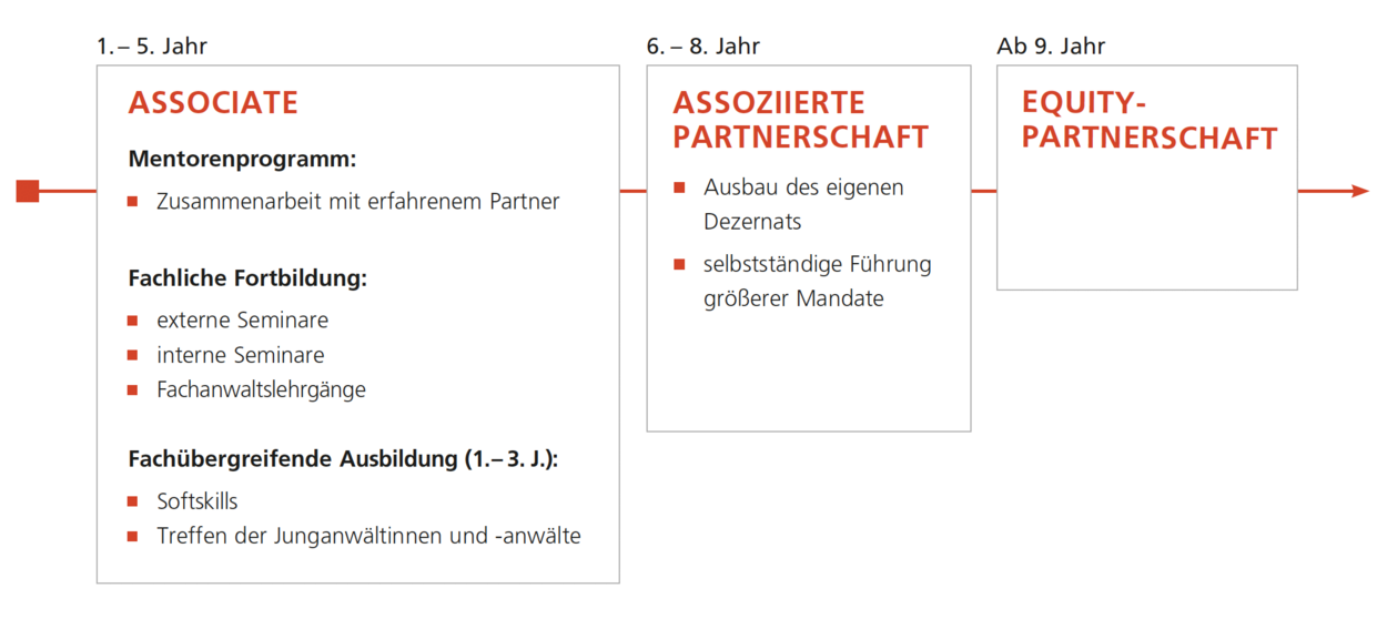 Assoziierte Partnerinnen und Partner vertiefen ihre Mandatsbeziehungen und erweitern ihren Mandantenkreis. Darüber hinaus ist ein wissenschaftliches Engagement als Autorin/Autor oder Referentin/Referent ausdrücklich gewünscht und wird von uns gefördert. In der Regel nach weiteren drei Jahren folgt die Entscheidung über die Aufnahme in die Equity-Partnerschaft.