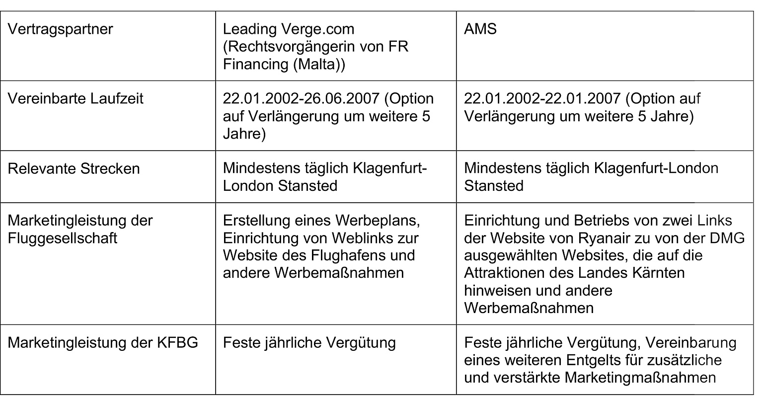 Am 21. Dezember 2006 vereinbarten der Flughafen und AMS ferner, dass AMS jedes Jahr ein Paket von Marketingleistungen nach den geltenden AMS-Tarifen zu erbringen hat. Diese Marketingleistungen umfassten einen Link von der Website www.ryanair.com zu einer von der DMG benannten Website, von der DMG benannte Inhalte auf der Seite der Destination Klagenfurt/Kärnten sowie E-Mail-Angebote, die für die Region Klagenfurt/Kärnten werben und an die Abonnenten der Website versandt werden. Die von der DMG benannten Websites durften keine Flüge, Autovermietungen, Unterkünfte oder andere Dienstleistungen anbieten, die in Zukunft auf der Website www.ryanair.com angeboten werden könnten, sie durften jedoch touristische Attraktionen und Geschäftsmöglichkeiten in Klagenfurt und Kärnten vorstellen.