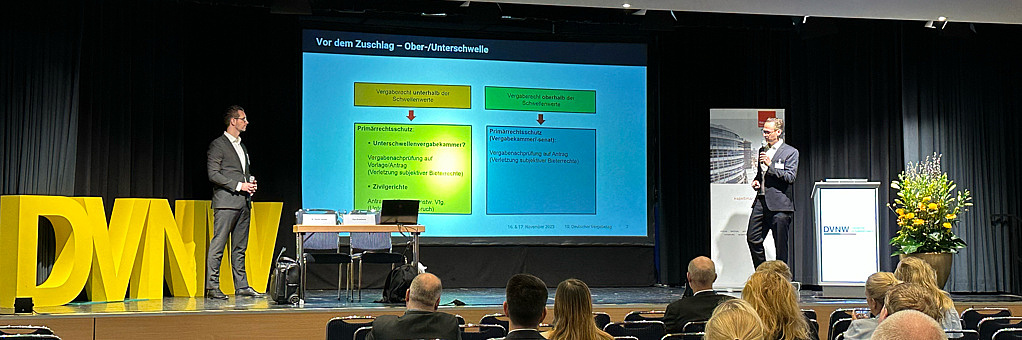 Am 16./17.11.2023 fand in Berlin der 10. Deutsche Vergabetag statt. Unsere Kollegen Dr. Martin Jansen und Finn Knoblauch (FU Berlin) förderten die fachliche Diskussion an Tag 2 mit Ihrem Praxis-Workshop zum Thema: