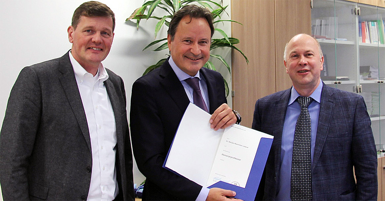 Seit sieben Jahren gehört die Lehrveranstaltung "Bau- und Ingenieurvertragsrecht" von Kapellmann-Anwalt Dr. Maximilian Lederer fest zum Lehrangebot der Fakultät für Bau- und Umweltingenieurwissenschaften an der Ruhr-Universität Bochum. Am 14. März 2019 hat die Universität Herrn Dr. Lederer auf Basis seines Lehrengagements und seiner wissenschaftlichen Leistungen eine Honorarprofessur verliehen. Die Urkunde überreichten Dekan Prof. Dr.-Ing. Rüdiger Höffer und Prof. Dr.-Ing. Markus Thewes, Inhaber des Lehrstuhls für Tunnelbau und Baubetrieb.